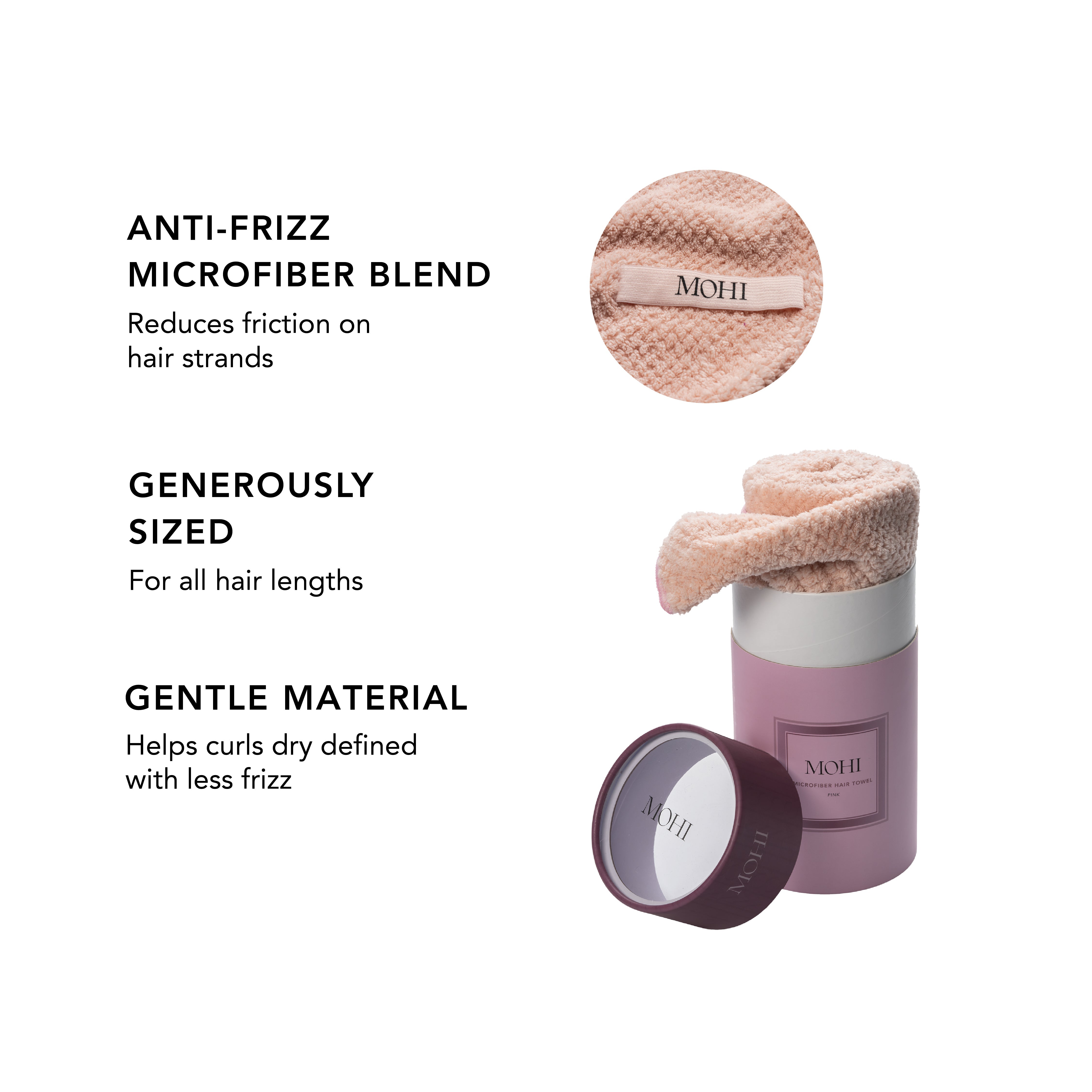 The MOHI Microfiber Hair Towel is thoughtfully designed to care for your hair gently when it’s most vulnerable right after washing. Thanks to the combination of polyester and polyamide, your hair dries quickly and efficiently without causing damage. Polyester provides strength and excellent moisture absorption, while polyamide adds a soft and smooth texture that’s gentle on your hair. Haircare repairs damage, but this towel prevents it. An essential tool for salons and perfect for clients to use at home. No frizz, no damage healthy hair without the hassle!